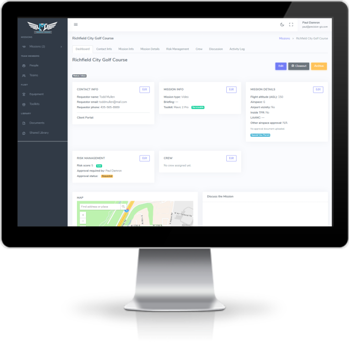 Track and manage all team members. Assign pilots, visual observers, payload operators, and support staff to each mission. Standardized pilot and operational logbooks.